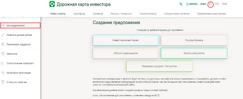 Нажмите «Добавить предложение» на главной странице портала. Выберите необходимую категорию: инвестиционный проект, покупка бизнеса, объекты недвижимости, земельные участки, природные ресурсы/концесcии.