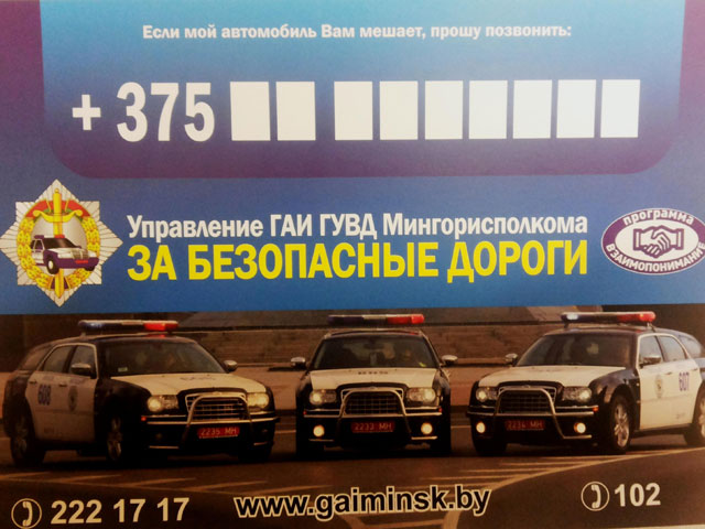 Если рядом есть люди, спросите, может кто-то из них знает, чей это автомобиль. Если же это не даст результата, то позвоните по номеру 222 – 17 – 17 это дежурная часть УГАИ ГУВД Мингорисполкома или в дежурную часть РУВД, можно воспользоваться и номером 102. Дежурный направит к Вам ближайший наряд сотрудников ГАИ.