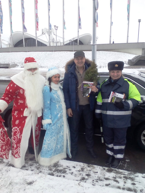Дружная команда во главе с Дедом Морозом и Снегурочкой продолжила дарить законопослушным водителям отличное праздничное настроение и, конечно же, символ Нового года - маленькую елочку, ну, а чтобы в дороге было веселее, радиостанция «Мир» вручала водителям музыкальные диски.