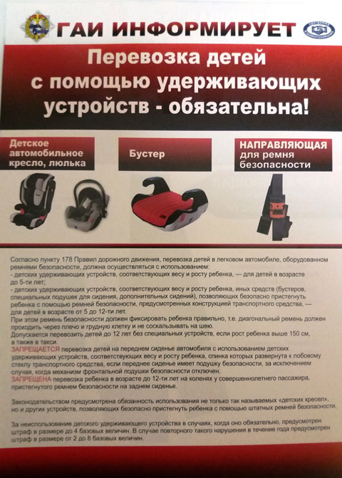 Напоминаем, что за нарушение правил перевозки детей в соответствии с ч.5 ст.18.14 КоАП Республики Беларусь в отношении водителя налагается административное взыскание в виде предупреждения или штрафа в размере до 4 б.в.