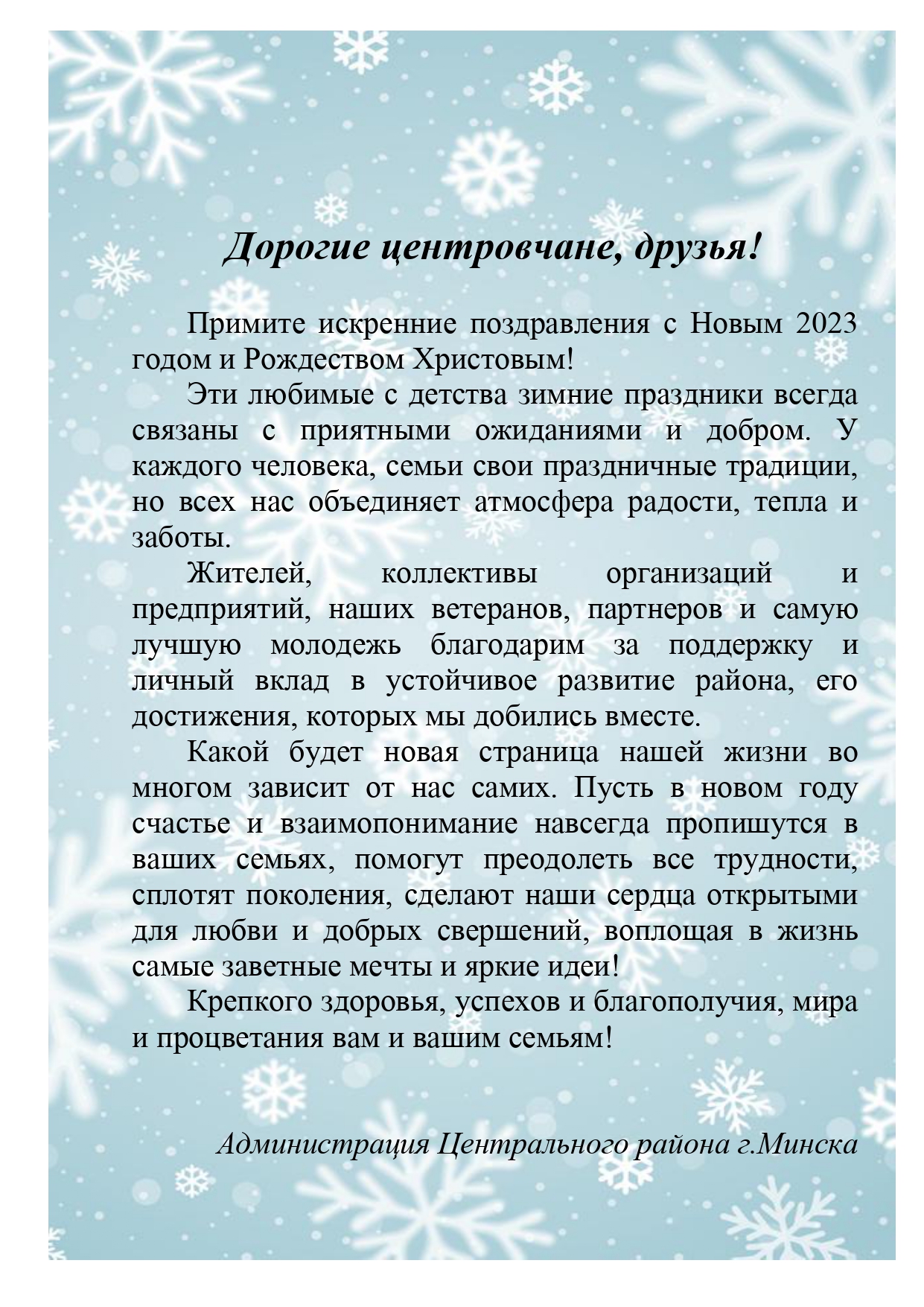 Дорогие центровчане, друзья! Примите искринние поздравления с Новым 2023 годом и Рождеством Христовым! Поделиться материалом: Facebook Twitter ВКонтакте Одноклассники WhatsApp Viber Распечатать страницу: