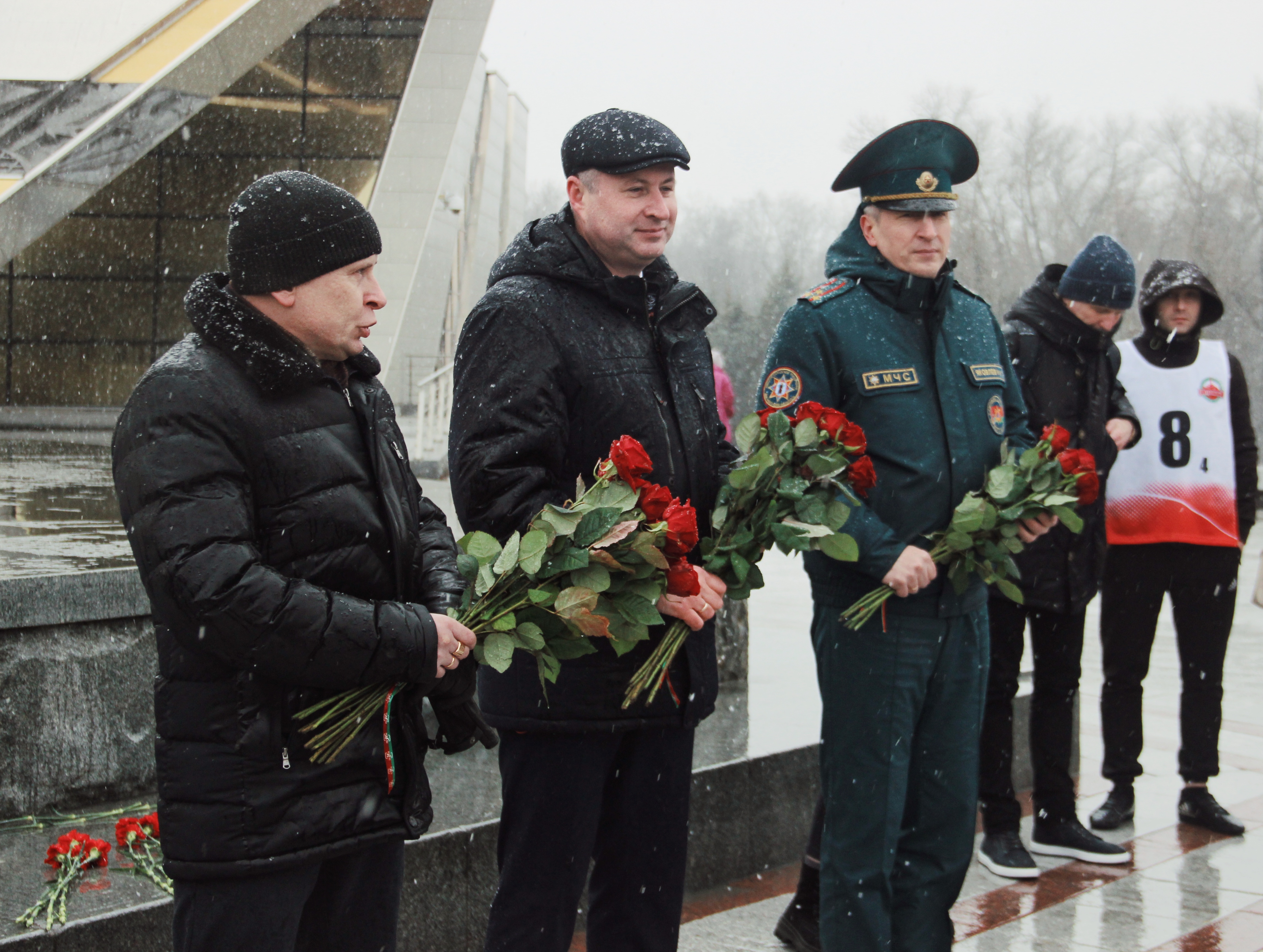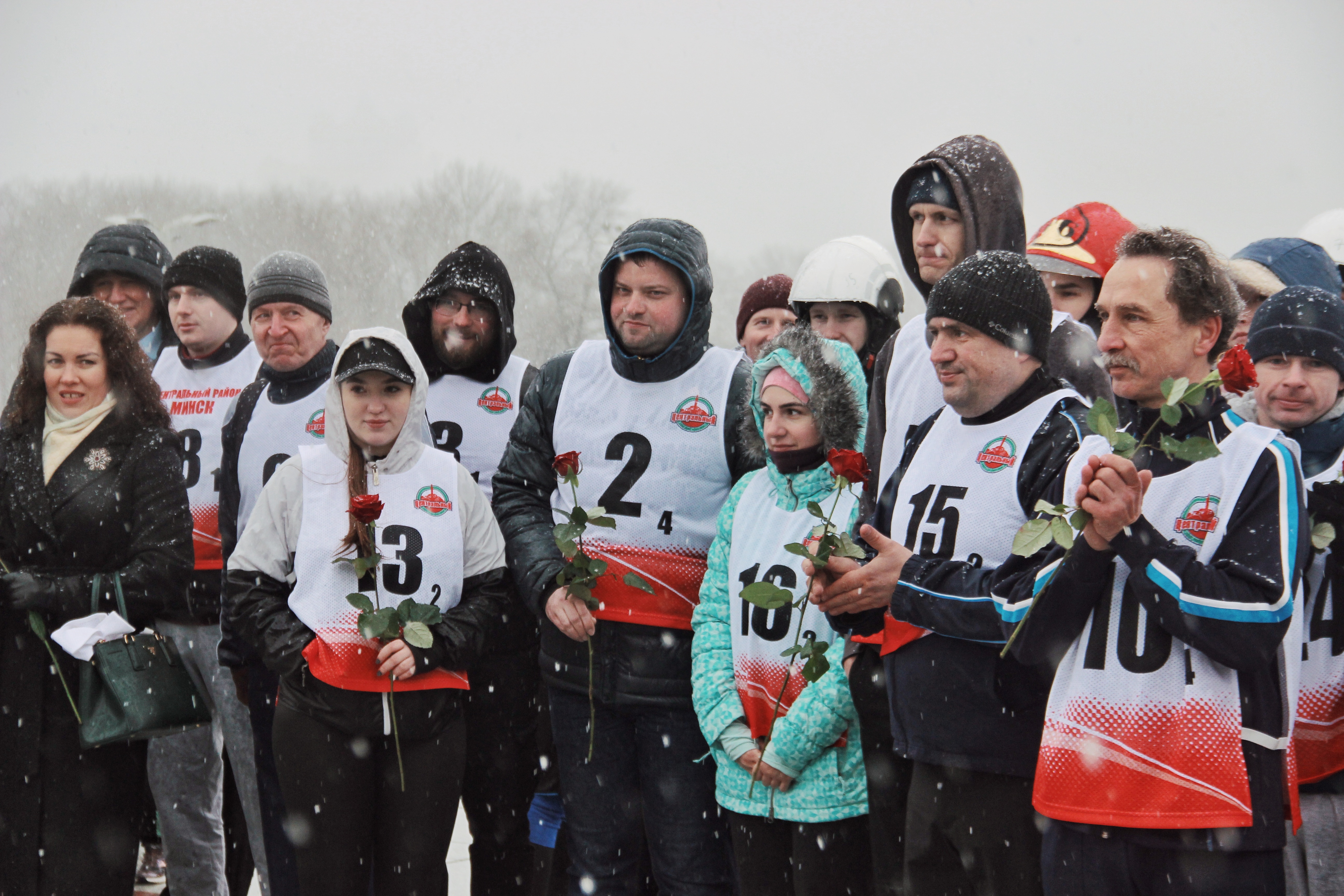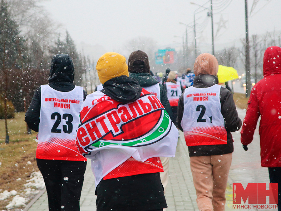 Несмотря на порывистый ветер и снегопад, у стелы «Минск – город-герой» собрались десятки неравнодушных школьников и работников предприятий района. Получив спортивную форму и необходимые инструкции, они возложили цветы к монументу.