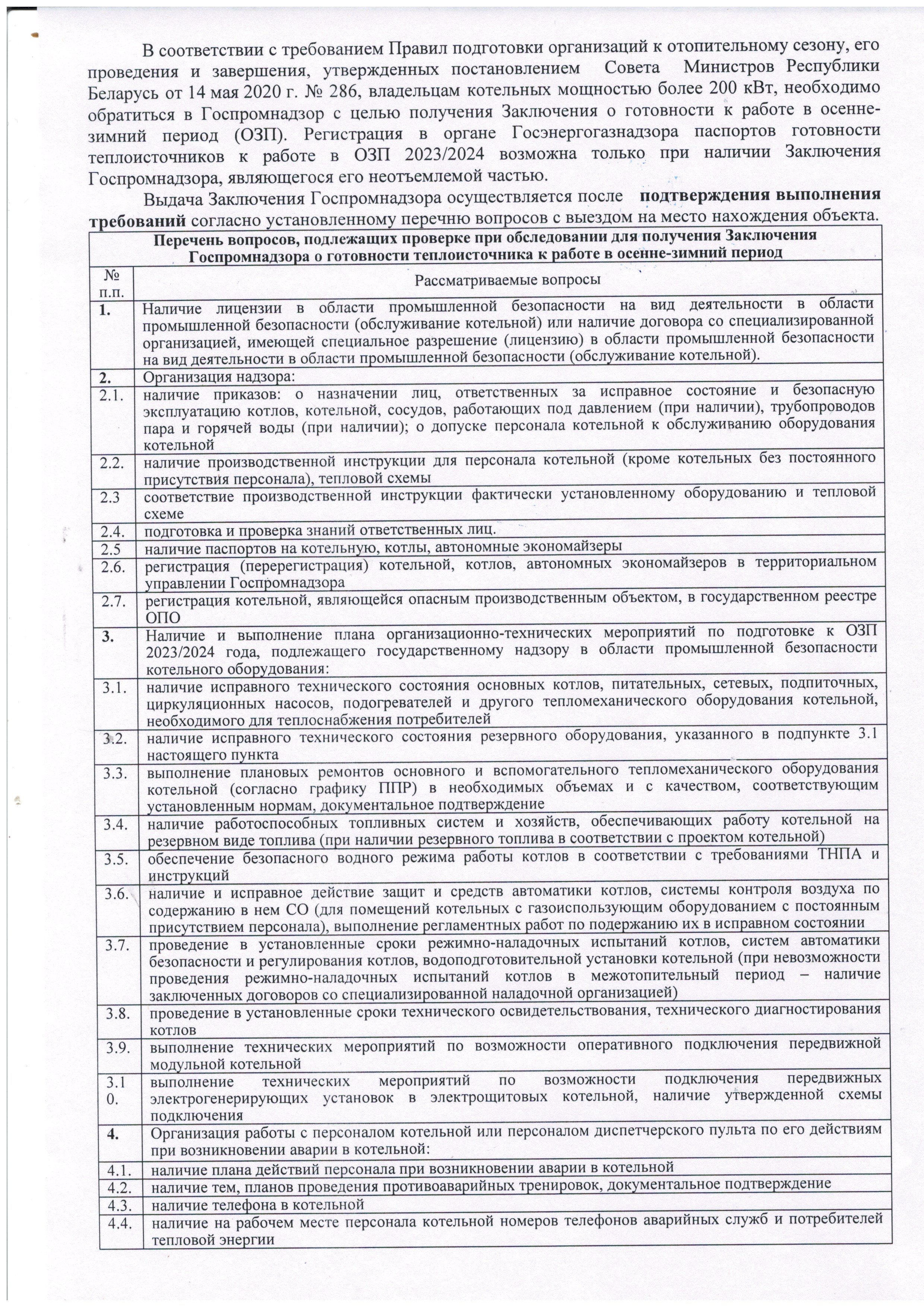 Перечень вопросов, подлежащих при обследовании для получения Заключения Госпромнадзора о готовности теплоисточника к работе в осенне-зимний период Перечень вопросов, подлежащих при обследовании для получения Заключения Госпромнадзора о готовности теплоисточника к работе в осенне-зимний период Поделиться материалом: Facebook Twitter ВКонтакте Одноклассники WhatsApp Viber Распечатать страницу: