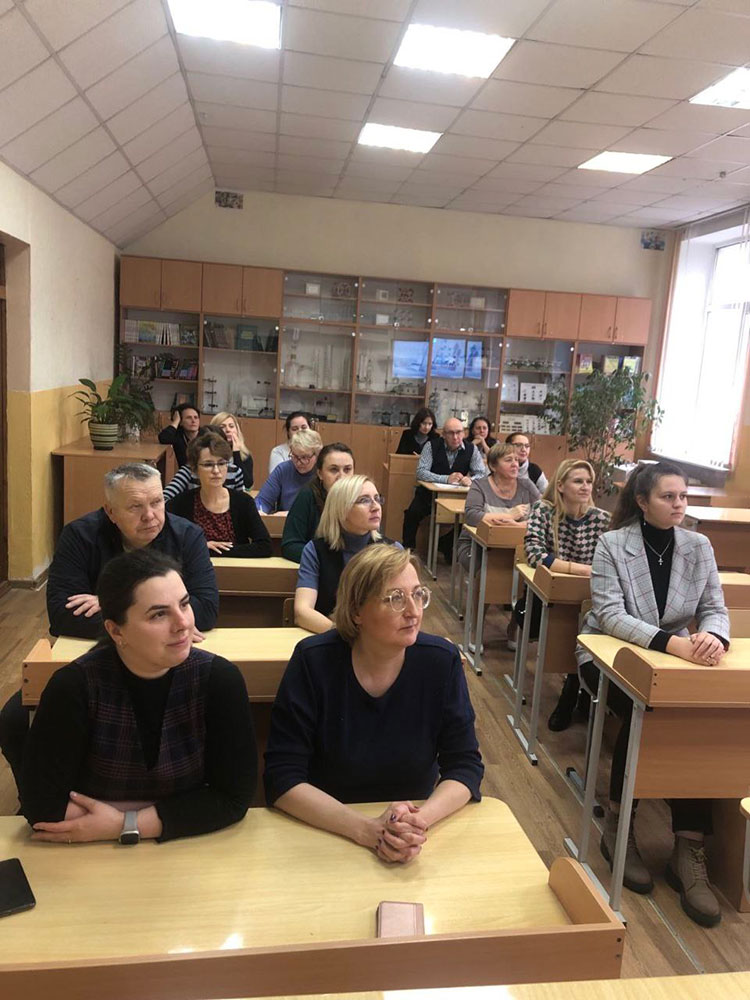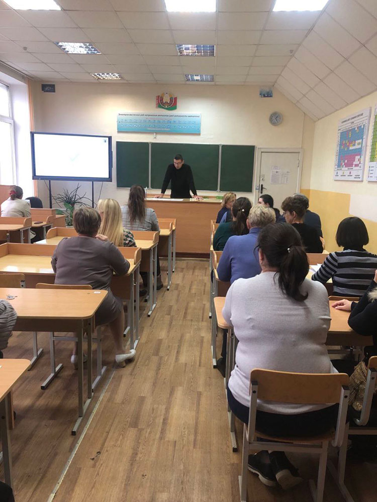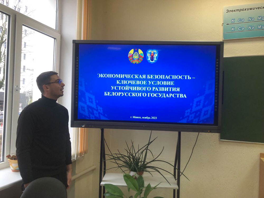 А в ходе Единого дня информирования «Экономическая безопасность – ключевое условие устойчивого развития белорусского государства» член Молодежного Совета при администрации, Караян Валерий, встретился с педагогическим коллективом гимназии 24.