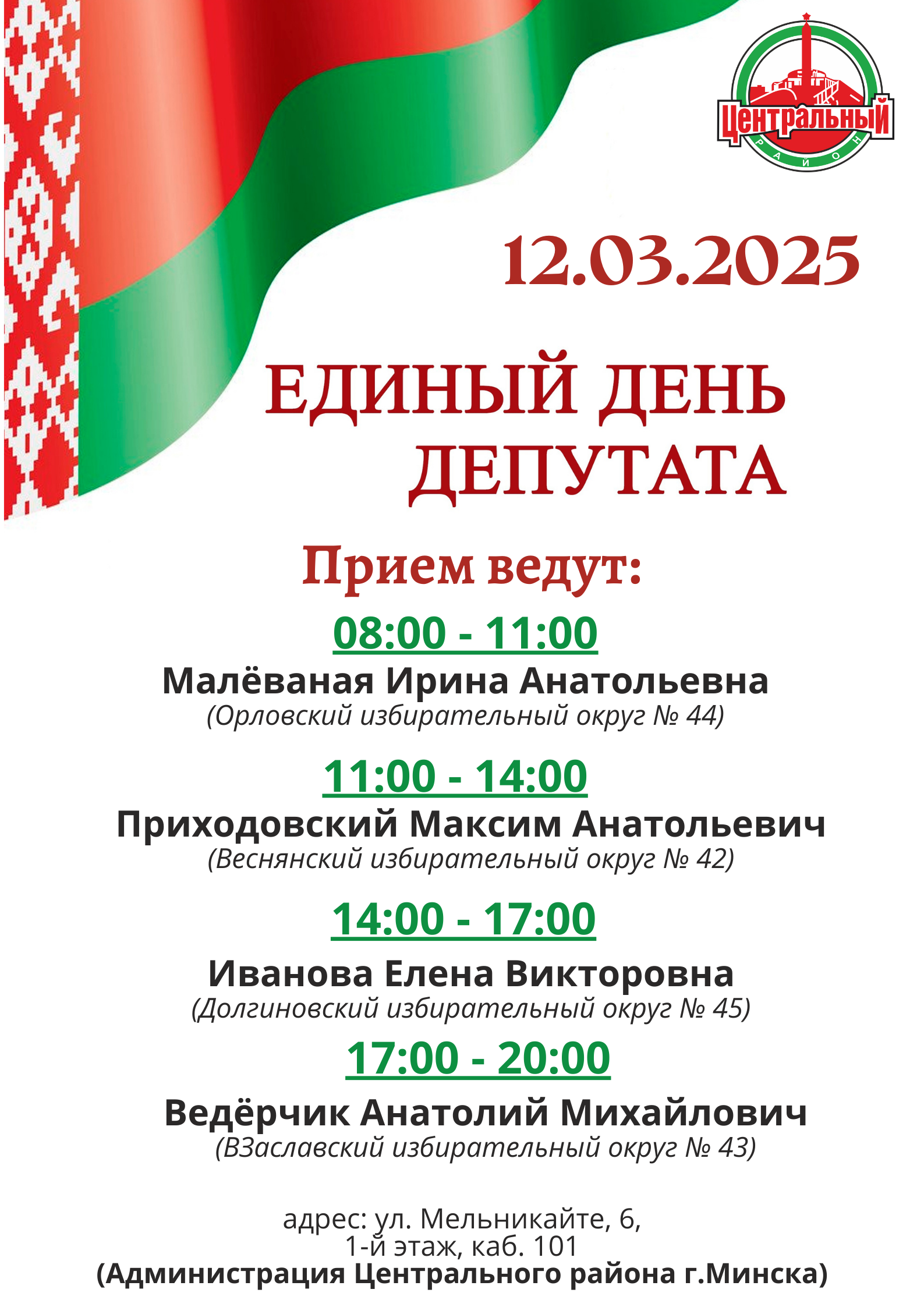 Единый день депутата пройдет 12 марта 2025 года Поделиться материалом: Facebook Twitter ВКонтакте Одноклассники WhatsApp Viber Распечатать страницу: