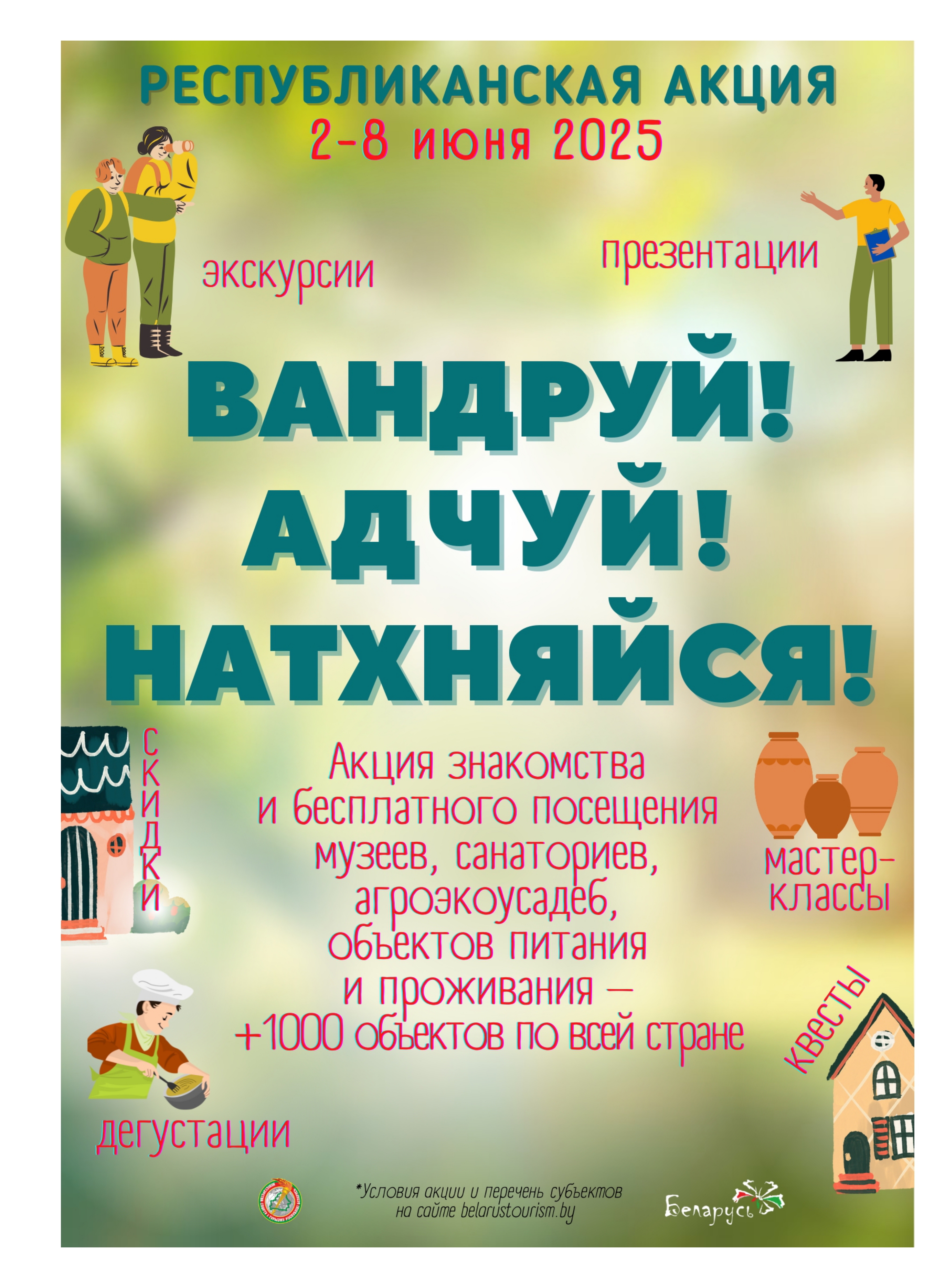 В период с 2 по 8 июня 2025 г. Министерством жилищно-коммунального хозяйства Республики Беларусьпланируется проведение республиканской акции по популяризации внутреннего туризма Республики Беларусь «Вандруй. Адчуй. Натхняйся».