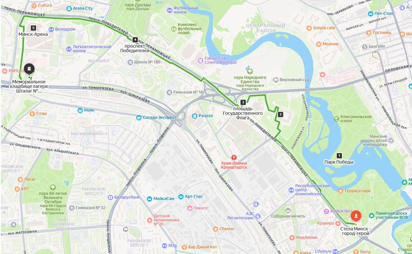 Полный маршрут: стела «Минск – город-герой» – парк Победы – Дворец Независимости – площадь Государственного флага – проспект Победителей – МКСК «Минск-арена» – мемориальное кладбище лагеря Шталаг № 352.