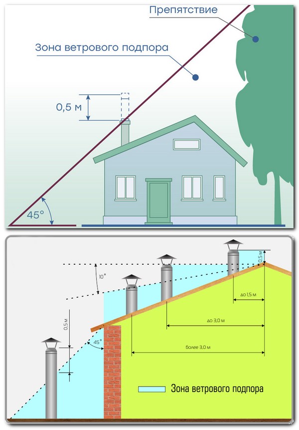 Зона ветрового подпора представляет собой пространство, находящееся ниже линии, проведенной под углом 450 к горизонту от наиболее высокой части здания, а также от верхней точки ближайшего строения или дерева. В этом пространстве ветер создает дополнительное давление, которое может влиять на движение продуктов сгорания в дымоходах и воздуха в вентиляционных каналах в том числе вызывать обратную тягу в результате чего угарный газ может попасть о в помещение.