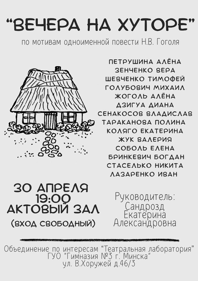 Объединение по интересам «Театральная лаборатория» приглашает на постановку «Вечера на хуторе» по мотивам произведения Н.В. Гоголя.