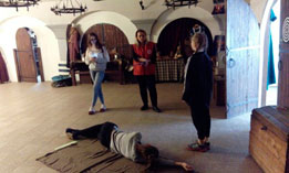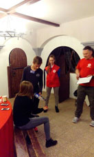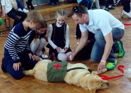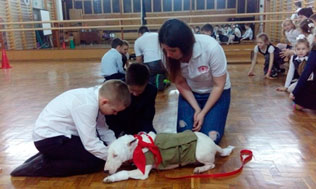 Волонтеры показывали такие собачьи профессии как собака-миноискатель, собака-санитар и собака-связист. Ребята с удовольствием проверяли, может ли собака быть миноискателем, пряча мяч, как импровизированную мину, у себя за спиной и когда ее находила собака, были в восторге. У учащихся была уникальная возможность полечить собак и попробовать их бинтовать, а также передавали через собак записки друг другу.