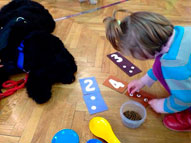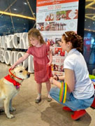 Первая точка активности – «Доготерапия» располагалась на первом этаже. Там посетителям были наглядно продемонстрированы элементы занятий детей с собаками. Каждый желающий мог поучаствовать и попробовать позаниматься с собакой. Большой популярностью собаки пользовались у детей.