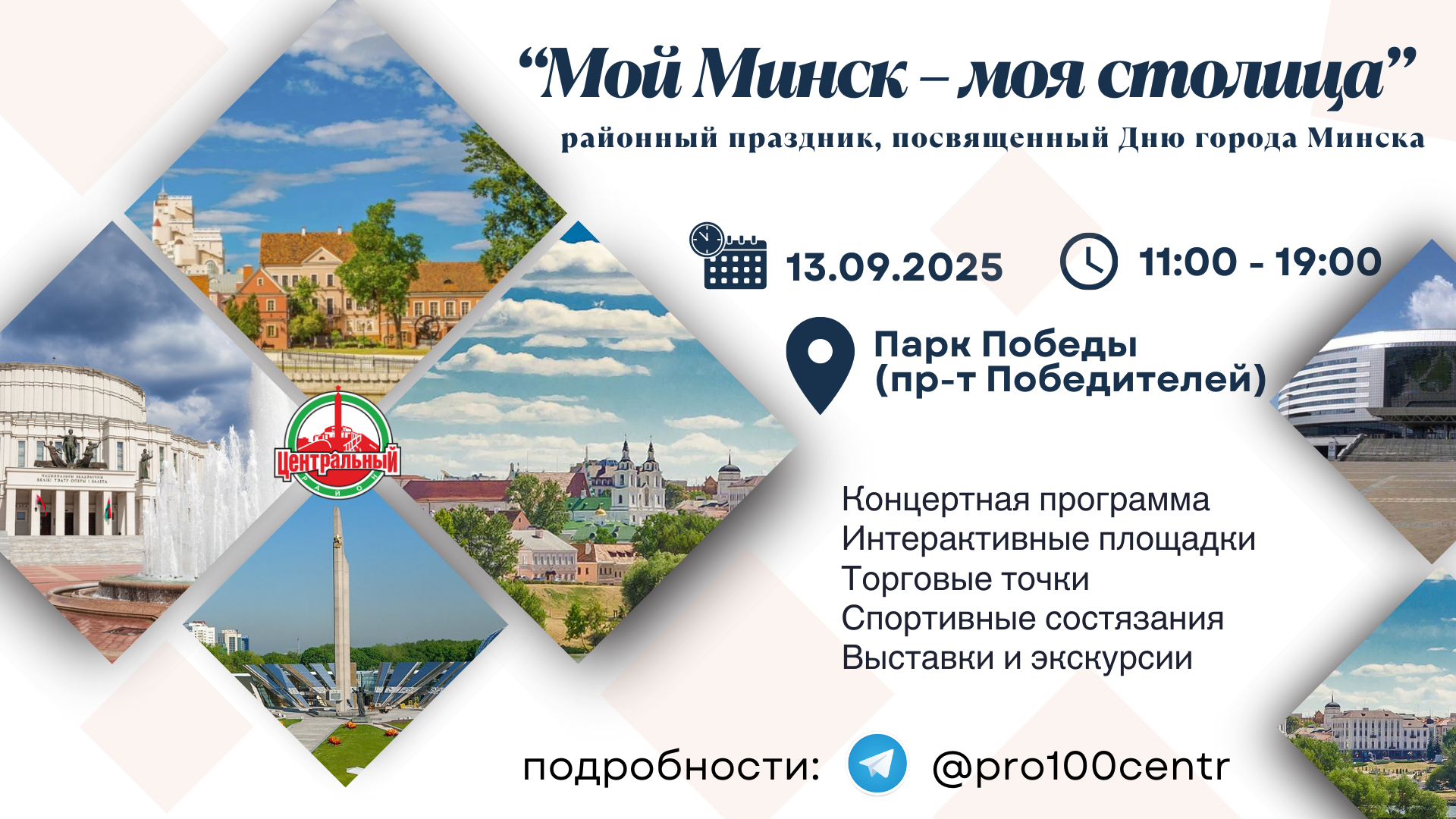 - Центральная районная организация РОО «Белая Русь»: интерактивная площадка «Горжусь тобой, любимая столица!» - викторина «Минск: история и современность», конкурс мелового рисунка для детей, призы и сувениры участникам.