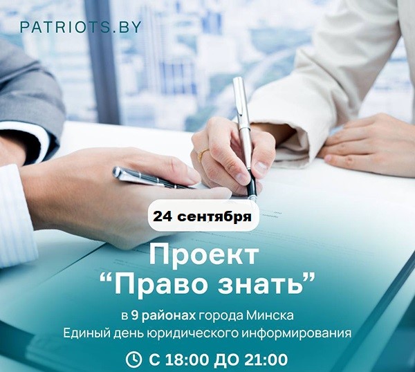 24 сентября с 18.00 до 21.00 в администрации пройдет бесплатная юридическая консультация в рамках реализации совместного проекта Республиканского общественного объединения "Патриоты Беларуси" с Белорусской республиканской коллегией адвокатов "Право знать".