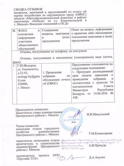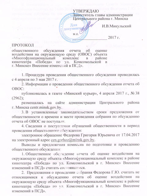 Общественное обсуждение отчёта об оценке воздействия на окружающую среду (ОВОС) объекта "Многофункциональный комплекс в районе кинотеатра "Победа" по ул. Комсомольской в г. Минске" Внесение изменений в ПСД"